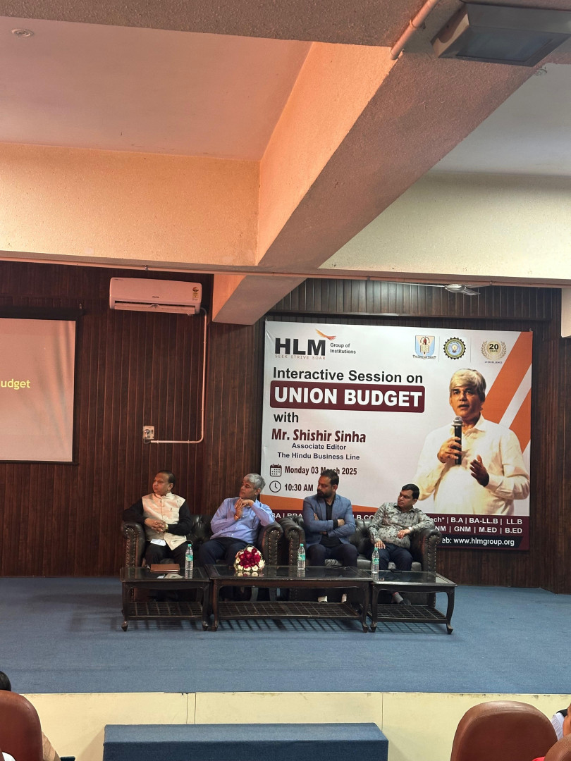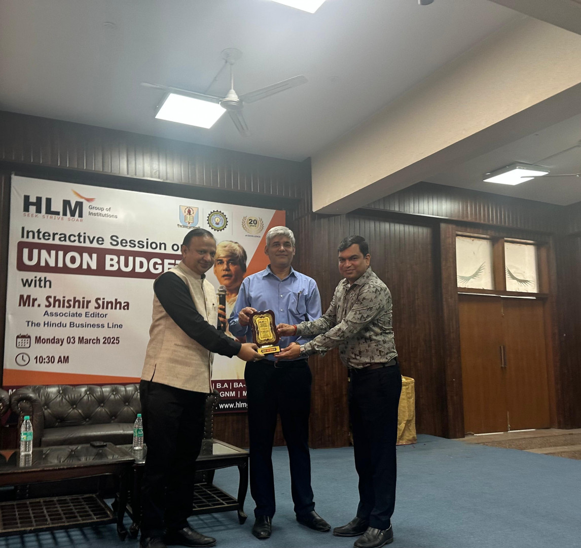 HLM College organized the Events of Union Budget, Mr. Shishir Sinha, who is an associate of Hindu business Line! The topic of the program was Union Budget! The program was inaugurated by lighting the lamp of Maa Saraswati Devi Ji! In the program, Group Director Mr. Anuj Agarwal and Assistant Director Mr. Dr. Dheeraj Sharma Ji heartily welcomed Mr. Shishir Sinha! During the program, the teachers and all the students of the college were present! While talking to the students of HLM College on the Union issue, Shishir Sinha Ji said that today's youth are investing and the older people save money! He discussed the country as well as the country's agriculture! On this occasion, the keynote speaker Mr. Shishir Sinha said that this budget of the Indian government has been made for the middle class and the general public. Through this budget, the government aims to make India a developed nation by 2047. He shared his views with the students about the features of the agriculture sector, MSME and industry and what facilities have been provided for them in the budget. The government, which gives income tax exemption, has provided relief to the middle class people for their salaries, which also helps the middle class people to save and invest instead of just consuming. At the end of the program, he also answered the questions of the students for various reasons.